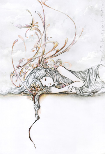 wow... your asking for a critique I think you already know this is pretty remarkable. But let me explain why this is so beautiful. The portrayal of the hair is so defined in movement, value, contrast and shape. Im sorry correction the hair, the flowers and the dress are rendered good. The sense of light in the picture is evident. The detail again is breathless, but the face and the arm are barely touched. Only hint of shadow is shown but that doesn't mean it was done on accident, theres so much detail in everything else the lack of value of the face is overlooked. Also the way you've mirrored the flowers and the hair and dress is clever. As the viewer i feel that comparing the girls innocence to a flower. Good concept!! I would go on but I'm sure your aware of how beautiful this is,