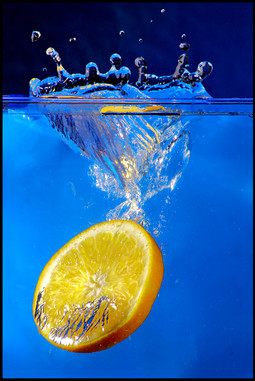 set the camera shutter to 3 sec for example , throw the lemon in the water , trigger the flash as it hit the water
