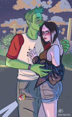 Raven’s cheeks flushed as she hesitantly complied. She slowly wrapped her arms around his torso. Raven was pleasantly surprised at his warmth and just how good he felt in her arms. This feeling didn’t linger for long, for half a second later, Beastboy revved his engine and took off at the speed of light.