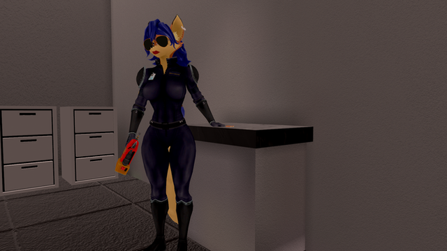 Before heading out on any bounty hunting job that's on offer, Ruby needs to suit up first. So she dons her full body rubber catsuit with her boots and kevlar gloves, puts on the belt and the holster with her mega-muck gun and then to finish off the look, her leather trench coat. Then she's ready to roll and earn her living.And if you're on her list, watch out!