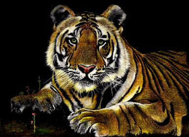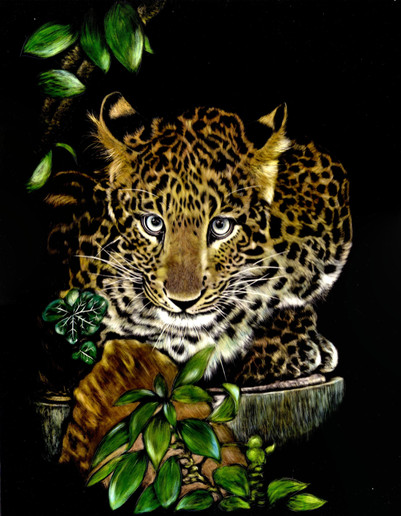 Scratched using surgical scalpel and fiberglass brush. Airbrush used to blend the lower body to the background.