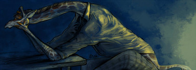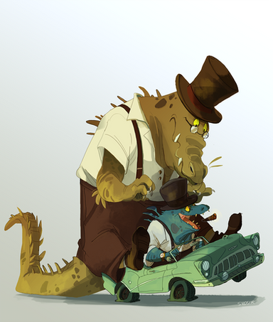 Our first assignment in Illustration II this semester was to illustrate a single word, and to do it in a way so that it wasn't blatant nor achingly subtle. The word crocodiles kept cycling through my head- not as the word to illustrate, but as the subject matter- and so I chose "awkward" as my word and came up with the idea of a crocodile businessman bring home a wildebeest friend from work only to find his wife preparing exactly that for dinner.Heh. Awkward.
