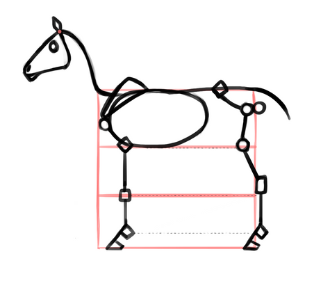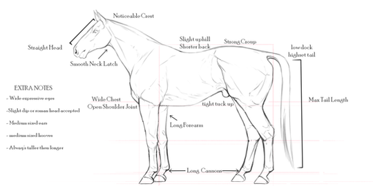 So. It occurred to me that my horses were getting kinda stylized a week or so ago, so I drew myself up a guide to refer to whenever I think a leg is attached in the wrong place, or the withers are too far forward, or whatever. And I thought you guys might appreciate a look at the stuff I need to remind myself of. This is just a warmblood standing mostly square, but most of this should hold true to many horse builds. Hopefully. This is remarkably cleaned up compared to how it was, for clarity.My terrible handwriting I will type out here for you, in no particular order, but I'll try to go left to right.