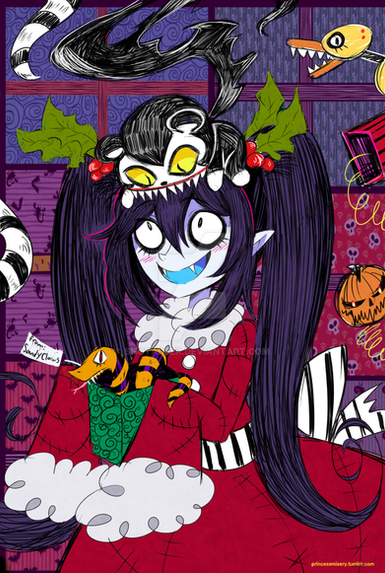 Very cute drawing of a cute character! I really like the background too...she looks adorably creepy here. :3