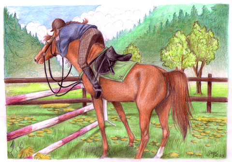 Schließlich standen eine aufgesattelte Jean, eine Jill und ein Fall auf dem 'Springplatz', auf dem Jill die Tage zuvor immer trainiert hatte. Jill half Fall beim Aufsteigen und richtete gleich die Steigbügel für ihn. Blind traf sie sofort die richtige Länge und hielt sie zu Falls Füßen hin.