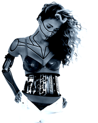 I love the whole effect that she has. by the way whats that thing comming out of her ear is that a microphone? the neck thing is cool it looks rippley. That cracked reptilian looking skin was badass too! Thats an awesome outfit she's wearing.
