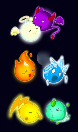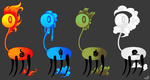 hes so cute but a little bit creepy and thats why i like him... i guess i wish they were all pets of mine i would use the chubby air cloud fellow as a pillow and the cute earth guy would do my gardening then i would cook meals with the flamey fellow and have the water guy sit in a corner and get moldy .....in a cute kind of way....i guess....he he