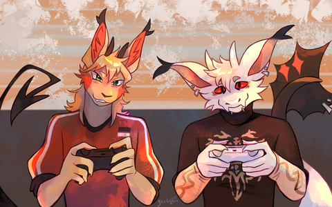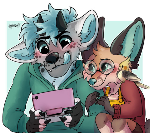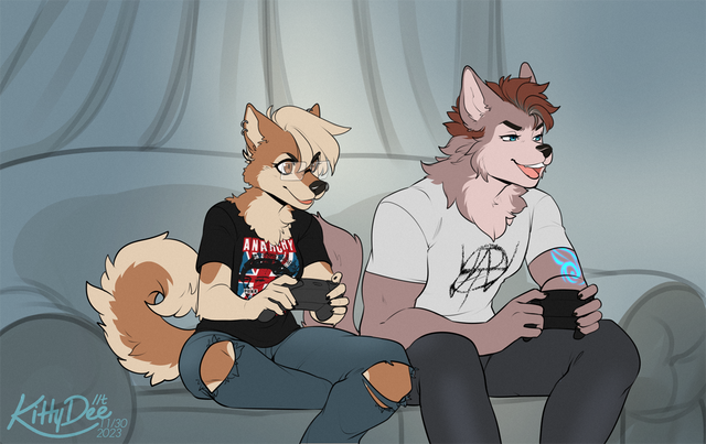 My boyfriend is not crazy about furries at all, but he still has fursona hahaThis is an illustration of how we spend time playing video game together. We both play Zelda, I'm on a Nintendo Switch, he's on a PC emulator