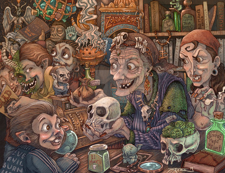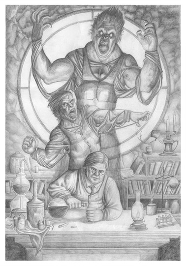 Excellent work! Great scene, and the girl scientist is very cute. I do love all the details in this. First off, is the guy in the chair the same guy from the wanted poster? Their smiles are similar. And the head mounted on the wall above the skeleton, is that the demon from "Curse of the Demon"? Finally, I love the assortment of mythical creatures in the cabinet, mermaid, cyclops, but is that a JACK-A-LOPE? Bwaahahaha!