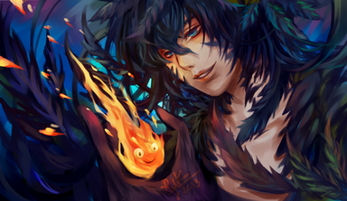 Oooh gosh, LOVE this. Great job of incorporating Howl's more feathery side, and incredible job with Calcifer * o * You really managed to capture his spirit! (Also, I love how you did the light and shadow!)