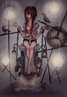 Great textures and shading. ^^ I like how the light colours contrast to the blood and the darkness of the idea.
