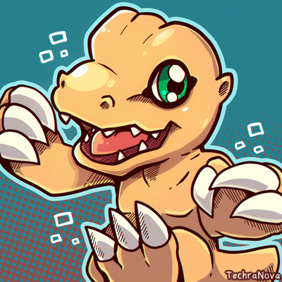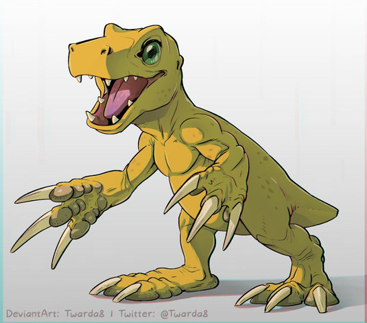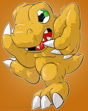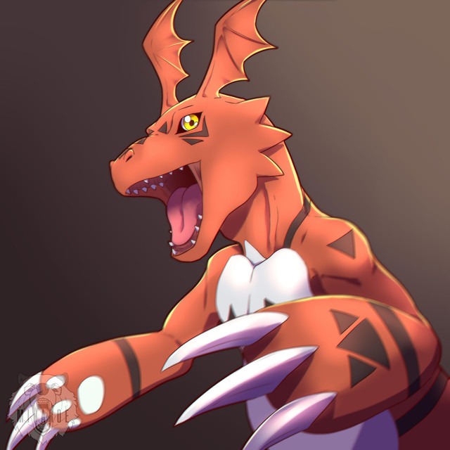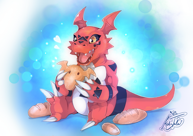 #bread #claws #fangs #feral #guilmon #kitchen #reptile #yellow_eyes #red_scales #blitzdrachin