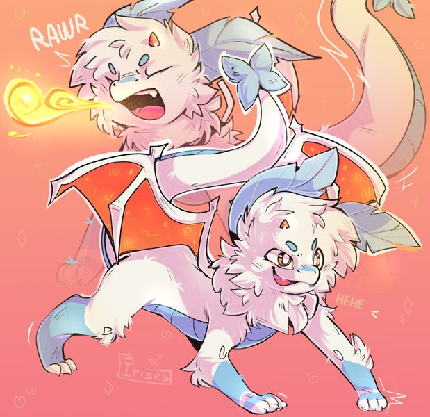 #cat #chibi #claws #coffee #croissant #dragon #fangs #fluffy #hat #horns #kemono #loincloth #scarf #sfw #whiskers #wings #blue_hair #grey_fur #white_fur #sifyro #blitzdrachin