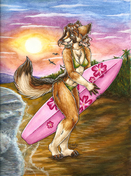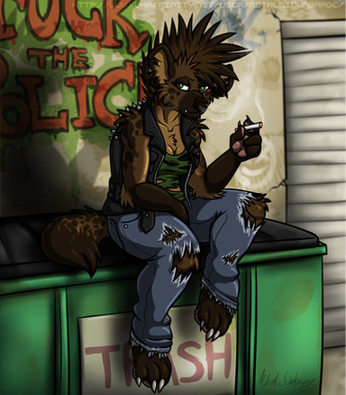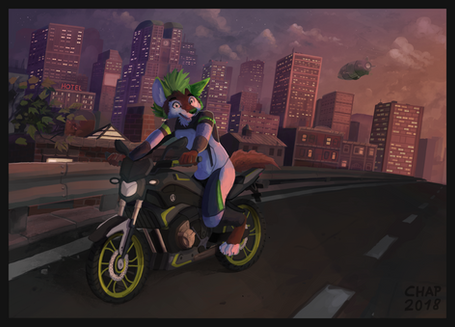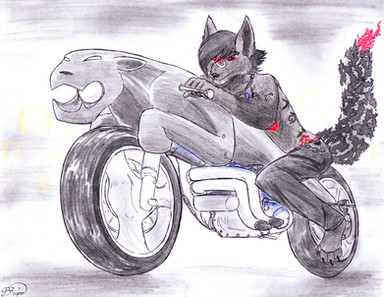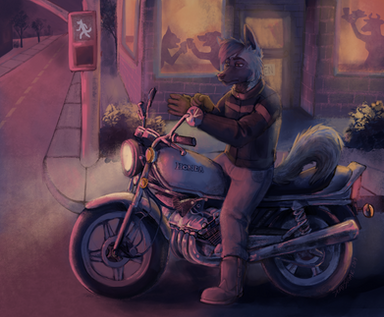 Anthrocon has a really cool theme this year (the Fast and the Furrious) so I couldn't help creating a piece to compliment it! I wish I could have been able to have it done in time for the conbook, but this year I was simply too busy.Domino, my hyena character, is out for a nighttime ride in the city on her motorcycle! This particular model is one I've been looking at for myself once I get my license. I'm really pleased with the colors on this piece, and I'm pretty proud of how the city and bike turned out considering I'm used to drawing natural things.
