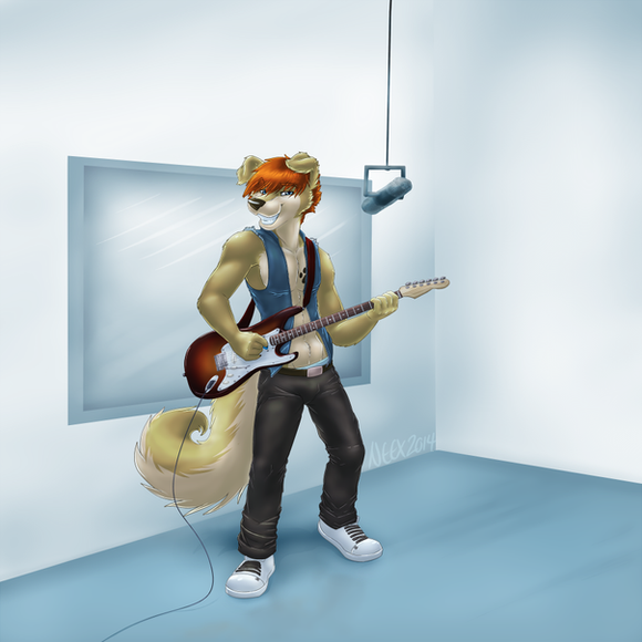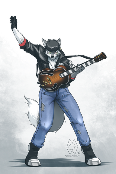 A punker husky rippin it out on an electric guitar. I actually own the amp he's stepping on, lol. This will be entered to the FA: United conbook. Yes I'm going conbook crazy, lol, I can't help it though, the themes are just so inspiring! Unfortunately since I'm unable to attend I'll be selling this guy at AC.Related content