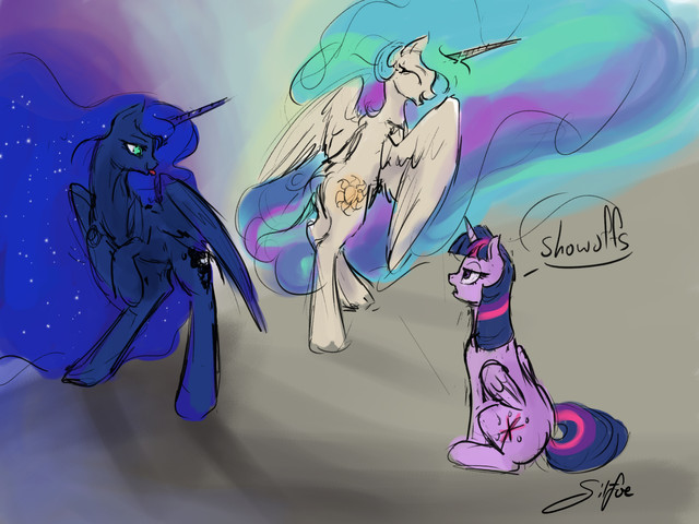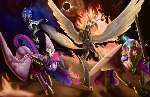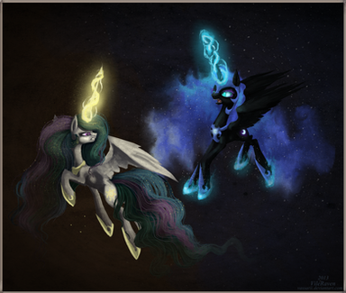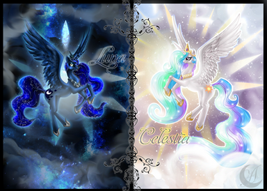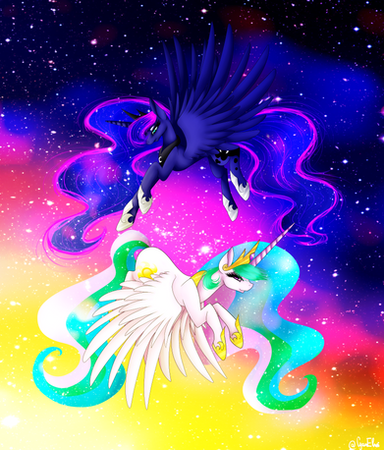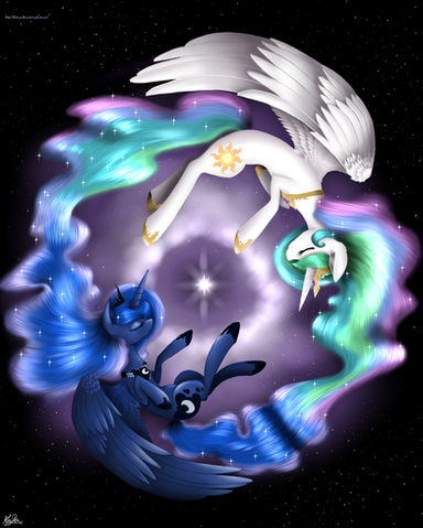 Yet another peice of artistic mastery by one of my very favorite pony artsists! This piece is simply stunning and I love the fact that you included both sisters into the subject matter and gave them both such a magnificent presence within the piece that they do not have to sacrifice anything to make the piece stand out! I love the character design as well as the scale and proportions that you used here! I also love the way that you were able to separate the piece while still making it work as a whole image! I particularly love the way that you made the lovely cascading magic that connects to both the moon and sun, as well as the way that you used the sun and moon as central lighting sources which are simply breathtaking! I also love the way that the light cascades through the bodies of the princesses while accenting the signature shading that you have to create an image that truly comes to life! The flowing manes are also a wonderful touch that shows both movement and beauty while working perfectly with the twinkles and other things that are present within them! Finally, I am really loving how the gorgeous color work that creates a lovely texture and adds lush radiance to this piece and adds the final touch! This is yet another fantastic piece and I can't wait to see more of your ever so exquisite art! Amazing job as always! Kind regards, Princess Luna
