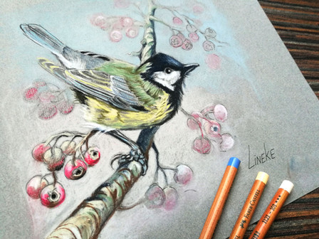 Again a great tit, Parus major, and maybe maple leaves. Done with coloured pencils on gray paper.