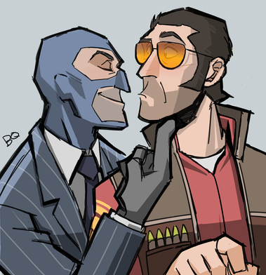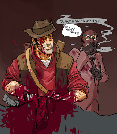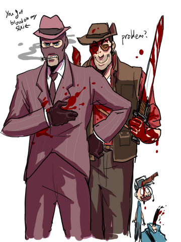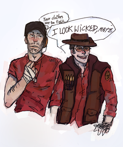 Despite it all Spy is still trolling him hard while Sniper struggles with the mask. Good lord, this is a good picture.