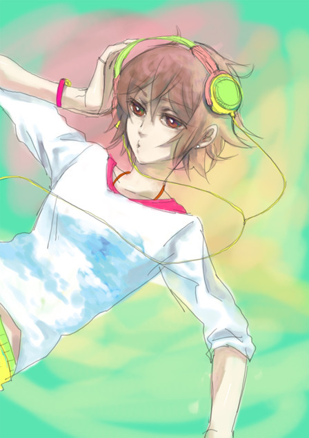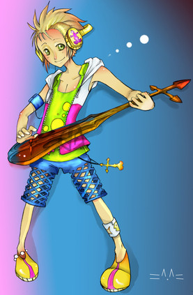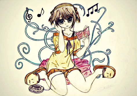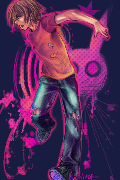 2nd page! I don't think I've commented on too much here, which is good. Fused fingers and music notes. Lol. So great. His right hand seems kind of long-ish and flat. Or his hand not in a fist thing? That's how I lean on it, anyway. Headphones are sweet. Is he sitting on a piano? He should totally be on Mount Olympus--henceforth the great expanse of sky behind him. Swirly yellow clouds. Great job with the water too, getting the feet under there and the ripples.