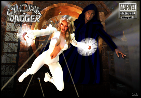 A piece done in Daz3d Studio, based on the Marvel comic's characters Cloak and Dagger. Did the textures for the costumes on this one, and I don't think they came out half bad. Of course, it did help that Cloak is mostly a big mass of black.Related content