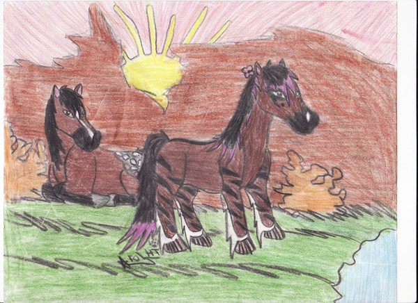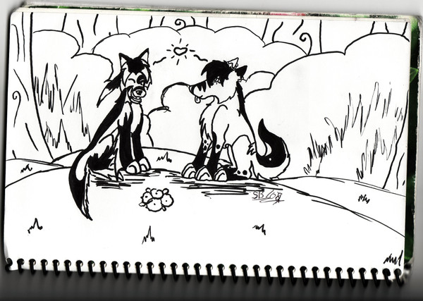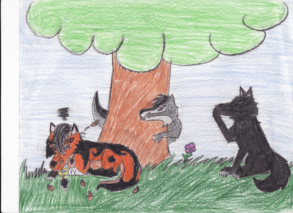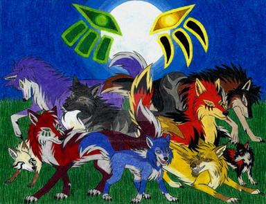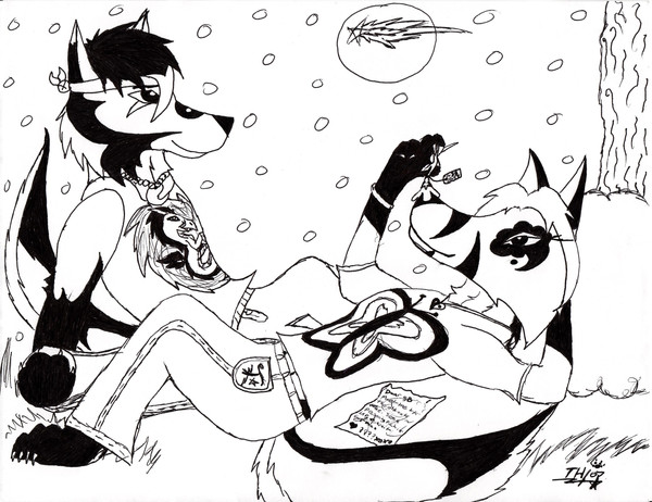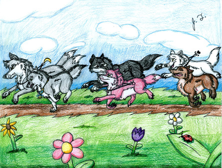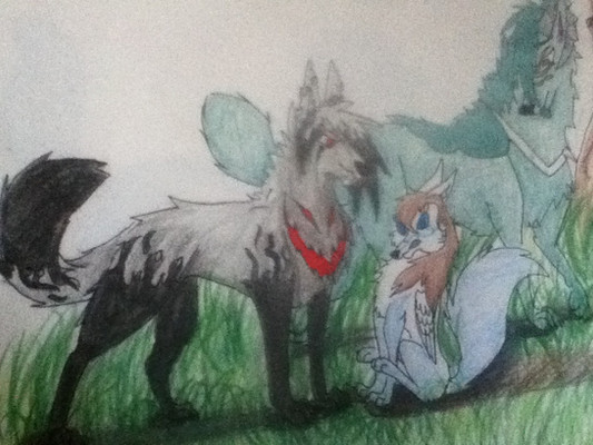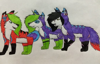 This is a pic of me with Celestialwolven2`s Nati, Blueshinewolf`s moon, Kyubigirl`s Lefa and Hikari-akita`s Limori. And once again i used black pen for the black parts of the pic and colored pencil for the colored parts.I had a really bad migrane today so i drew this. i guess it`s a little fan art pic because i love all their art!!