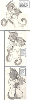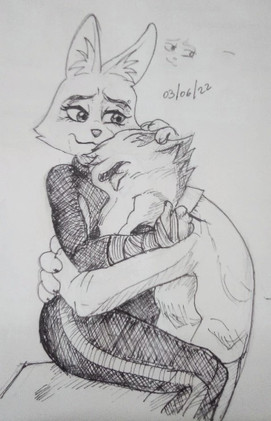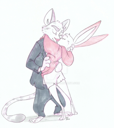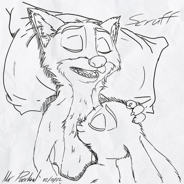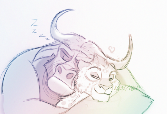 Such inspiration couldn't go long without some art to back it up. Mordecai and Charlotte portrayed at the end of my little drabble 'Inevitablity'. Mordecai is considering the reprecausions of their intimacy, whilst basking in post passion glow, with his lady dozing comfortably in his arms.It was weird drawing him a little mussed up, since he's usually so pristine. Ears relaxed, eyes half lidded, fur messed up. I think I like this better >