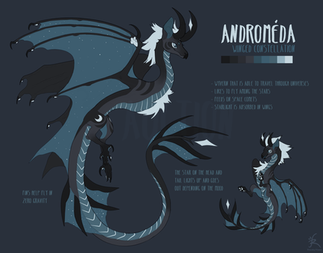 I couldn't decide between two color schemes, so in the end I've decided to just make them both OCs.This is one of the fluffy dragon-y sisters I wound up making, this one is Andromeda. I've seen a lot of starry sky-themed colors on characters and I've always loved it, I wanted to try my hand at a character of my own. I wound up with two in the end!