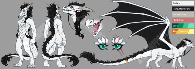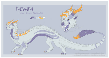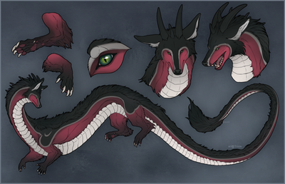Let's get the ball rolling with the most recent reference of my flagship sona, Kit. I originally designed her way back in the early 2000s and while details have changed since then, she's still a silver-grey dragon with a blue mane and silver horns. She's been around a long time.Her stripes are vaguely based on striped kukri snakes, I love their vertical stripes and the little stripe of color along their spines. She has silver teeth to match her silver horns. Maybe her bones are silvery as well?