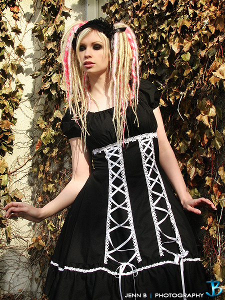 Some people have been talking about the model's expression. I really like it in the picture on the right, but not on the left. On the left it looks like you guys were going for that "Oh my!" sort of caught by surprise look, but she ended up having to hold it too long and got stiff and the "surprise" went out of her eyes. Which is unfortunate because I bet it was hard to get your rabbit to hold that pose ~_^ Like I said, I love her expression on the right. She looks a lot more inquisitive and mysterious. Plus I love the makeup on her cheeks--the shimmer is perfectly whimsical. I also love the way you've done her hair; it's not the conventional perfect Alice hair, but it's not ridiculous either. I wanna do my hair like that!