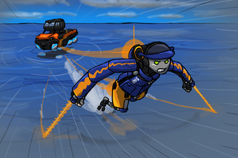Their suit is inspired by their own life helping the family fishery. Morgan uses an modified deep sea diving suit owned by their family and transformed an old delivery motorcycle into their own racing veichle. Inpired by the harpoons they saw in the docks while working as a kid, Morgan uses a grappling hook for their special trick.They also keeps an old fishing bait owned by their grandfather as a lucky charm.