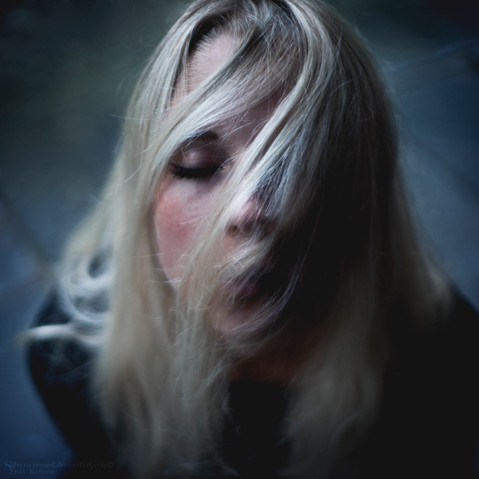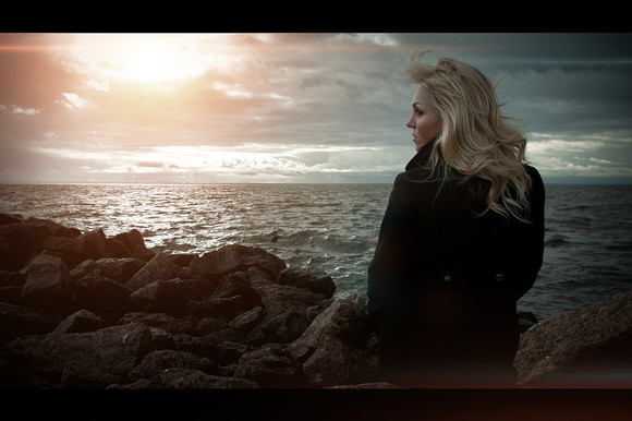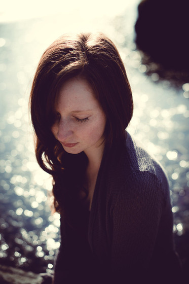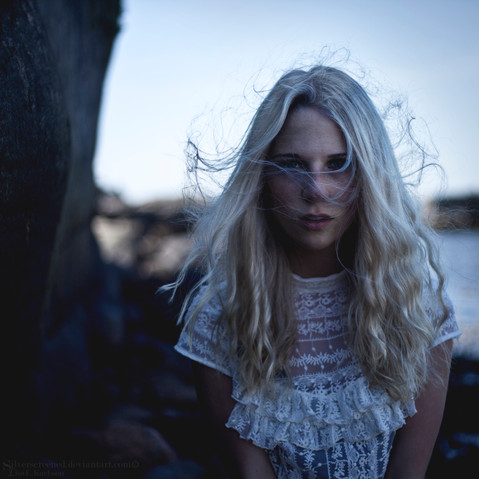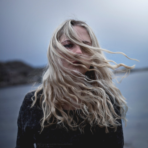 (Smile)"/> The wind sort of gives that romantic feeling from movies and gives a sense of awe. The face of the girl and the way she is staring gives the sense of sadness. A lot of emotion was channeled into this picture. Also the way the photographer focused on her. The blur of the ocean behind her and the dark ricks make a very good background! This is a really good photograph and it is really beautiful! You have an excellent sense of emotion and background for your images!