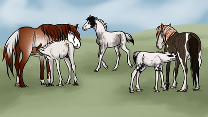 Left to right: Pinto mare, Knabstrup foal, Tennessee Walker foal, and Appaloosa foal. x