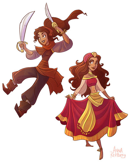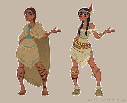 Okay so I would like to share with you the fruits of my bachelor's thesis. I wrote about, and studied how “non-white” characters, in western media such as film and video games, are portrayed. I chose three different cultures/ethnicities (non modern as I wanted to use Disney movies as an inspiration). I started this project in an earlier college course in which I redesigned three Disney princesses, these were Pocahontas, Jasmine and Mulan. I got this idea from Claire Hummel and you can see the old versions here: Jasmine Pocahontas Mulan