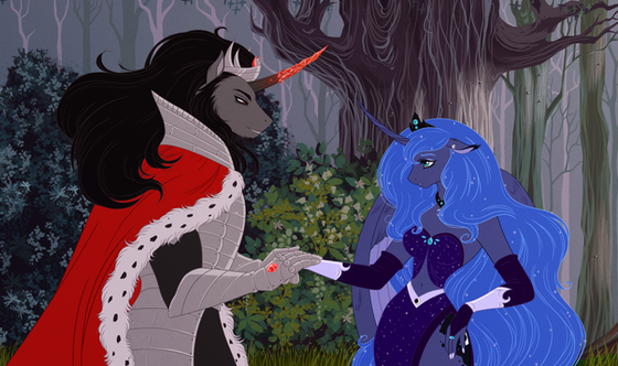 It didn’t take long for Celestia to find the source of the whispers. She easily spotted her new acolyte talking to one of the castle’s library assistants, Mentee Prim. The conversation itself was harmless, with small talk abound and a few thanks sprinkled in. However, when Mentee pulled her gift out of her satchel, Celestia’s cold stare stabbed at Mentee’s glimmering eyes. Celestia scrutinized deep into Mentee’s heart, seeing through her feeble façade. This was no mere thanks, the pink mare’s soul pounded with infatuation. The way she kicked the dust and tugged at her hair all the while coyly glancing at Valiance left no doubt in the Princess’ mind; and it filled her with vile intrigue.
