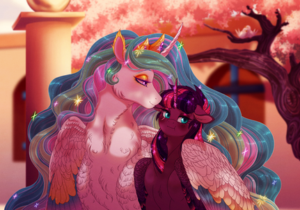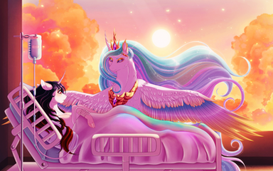 Valiance and Mentee were not alone, the God Princess, Celestia, too had wished to enjoy a stroll to revel over her recent success. True to her word, the Princess oversaw the remainder of the changeling hive eradicated and their maggots turned to fertilizer. With that, and the acquisition of a new acolyte, Celestia had almost considered relieving her favorite student of her friendship studies for the day. Almost.