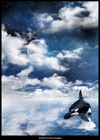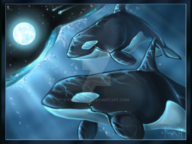 This picture is so beautiful! I love the background, it's amazing! And the whales too! Reminds me of Sea World at night. ^-^