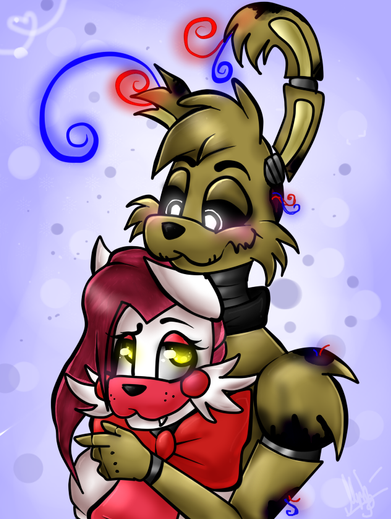 A request from my best friend from school, Teddy. He has been wanting me to draw Mangle and Springtrap as a couple, and how could I say no to the little guy? ^w^ After all, I feel I should draw Mangle more oftern, as I may be cosplaying as her for Comiccon this spring, As I said in my last pic.. Ever way, I hope ya'll like! :3-/_KerCHInG!