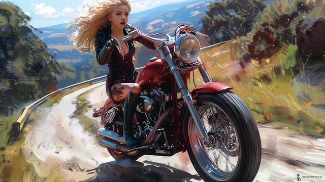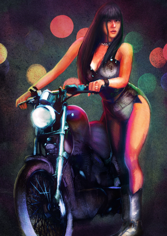 ItΒ΄s really hard for me to distinguish this picture from a photo. You worked out so many microscopical details that I really have to believe you that the picture took you 25 hours and more, even if I think 25 hours are nearly too less. Especially exciting in the picture are ( beside the perfect similarity to the original Jennifer Garner ) the astonishing reflections on the chrom-parts of the motor-cycle. IΒ΄m just jealous.
