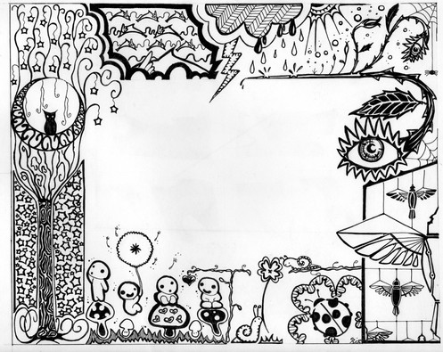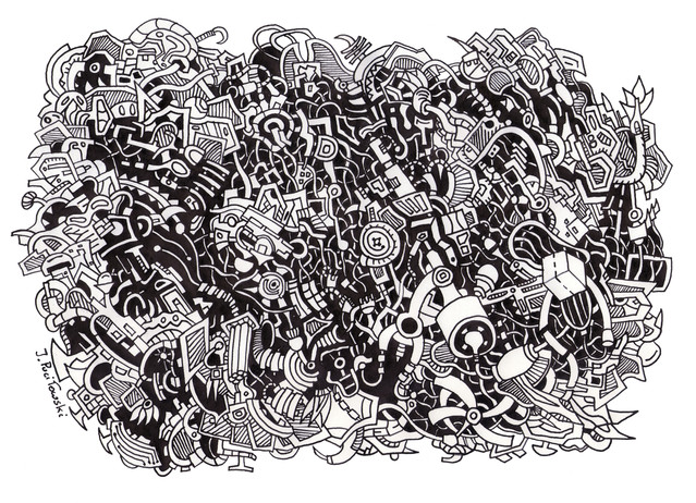 Thanks! Well..all the drawn detail is from the same pen (just a standard Artline felt-tip pen). Then there were a few pieces I pasted on top, like the darker circles, the squares at the bottom and the robot itself
