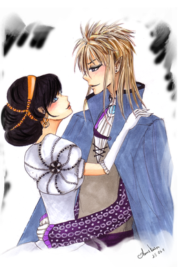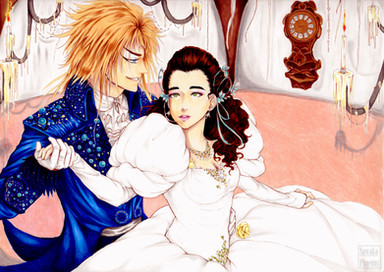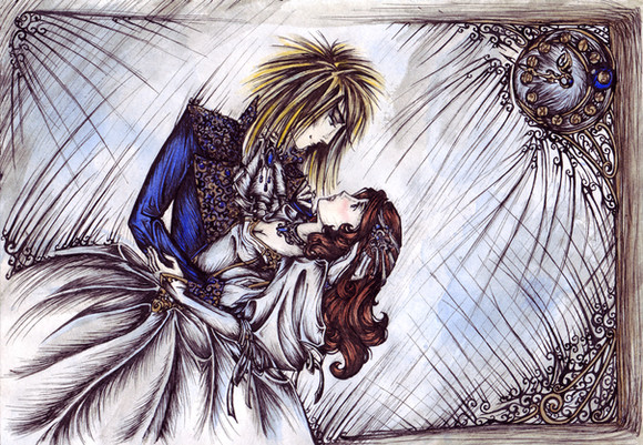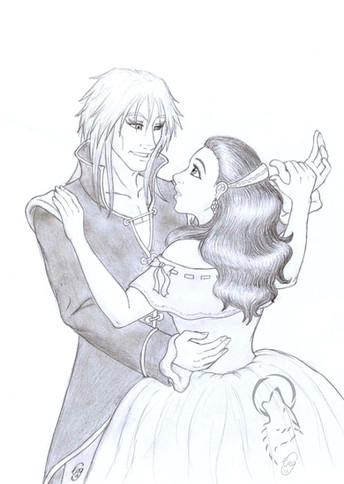 Sarah and Jareth from Jim Henson's Labyrinth. Couldn't find a proper color for his cape... Just a smal detail : The color of the jewels on her chain is Orange, just like a certain Peach...Promarkers and china ink.