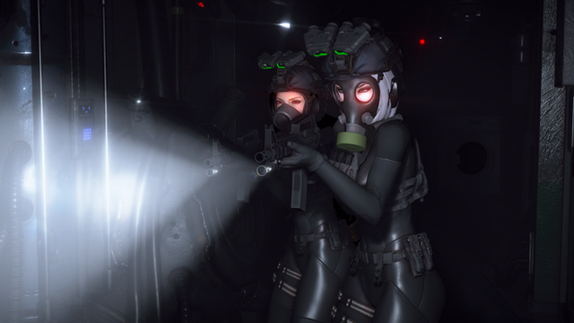 One day, she was heading to the pool to enjoy a relaxing swim. She changed into her black bathing suit and wrapped a towel around her waist. She was about to leave the locker room when she heard a noise behind her. She turned around and saw two red-haired women in black bodysuits and gas masks burst in. Samantha was surprised and scared. What were they doing here? Who were they?