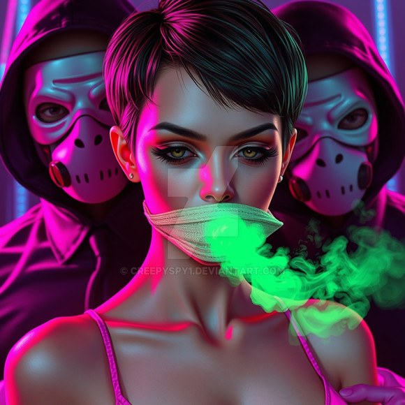 The women didn't say a word. They pushed Samantha against a locker and put some type of gag in her mouth so that nobody could hear her scream. Then Samantha realized a strange smell and started to fear as she saw the green fog that slowly filled the room. One of the red-haired women said in a muffled voice, "Take deep breaths. It will be over soon."