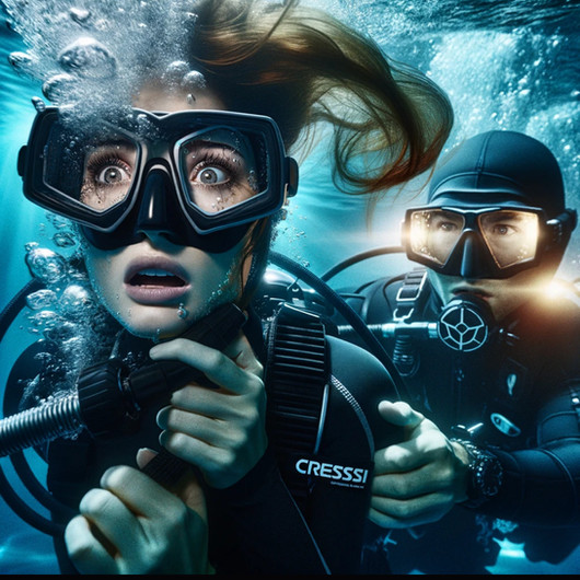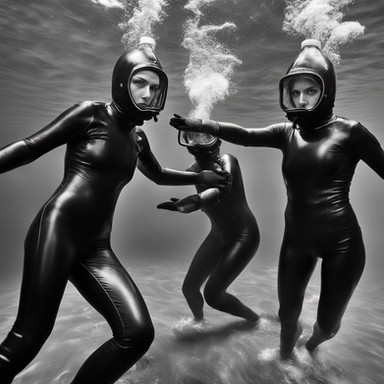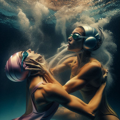 thick green fog, two young female russian swimmer, one wears a gas mask and holds a second mask in her hand, the other screams and cover mouth with one hand with the other she reaches for the second mask, next to a pool, they look at eachother