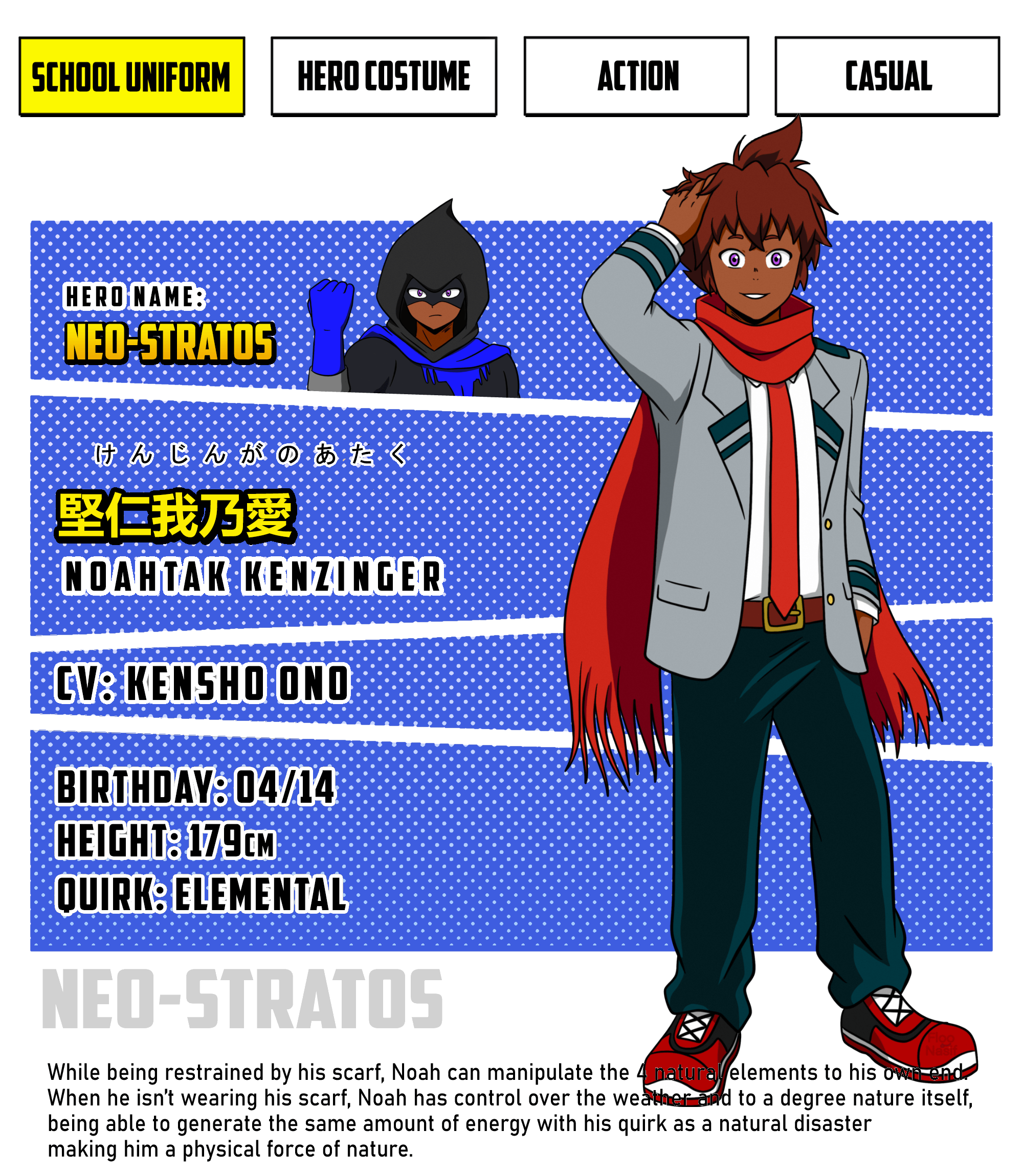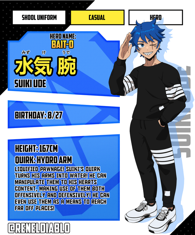 Extras- though he is a laid back character(kind of reminds me of Todoroki) he has a huge soft spot for his family, when he made the promise he lives by it, no matter what it takes he wants to become someone he knows his grandparents would be proud of.