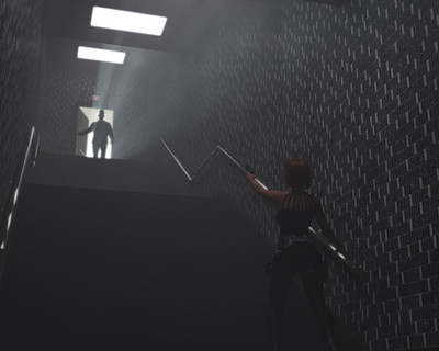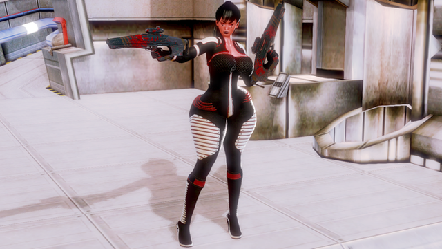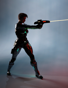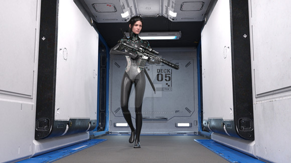 DS410P, Iray, no postwotkG8F as Azalea by Anagord with Bella Bleu hair by SWAM, SciFi Samurai body suit from ZKuro, NEO High boots by FUNTasi LAM Eyes (right) and SYIBLE Cyber eye (left), and wielding Haze Tool (right hand, with scabbard on right thigh) and Heacy Carbine from Adventurers's Toy Box - Weapons Edition by Cichy3D and Rane, in Stonemason's Sci Fi Interior 2015 (converted to Iray materials)