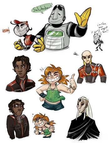 Beta's definitely my favorite so far. She just came out exactly the way I wanted. Love it when that happens.I know the E-Series robots are all referred to as 'brothers', but the flickies inside them are Birdie's parents. Either Beta or Gamma is actually a mom in there. I picked Gamma to be the dad because I kind of liked him as being Ethan Mars as a pink bird piloting a mech.