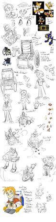 Now for Tails, there were a number of things I wanted to incorporate: a physical disability/mutation, the unlikely ability to fly and go fast, and the love for gadgety things. It wasn't too long before I settled on having him in a wheelchair to accomplish all those things.
