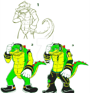 I, for one, love unsquishy Vector. Not that I mind him being a big doofus, but he's a 6 foot crocodile and can clearly wreck shit when he wants to. Vector's one of my favourite characters so this drawing makes me very happy. I love his exaggerated spikes and his rarely-seen fire breathing ability! And DAT INTENSE LOOK ON HIS FACE. <>-<>