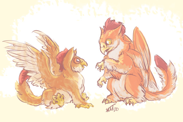 Awww, so sweet! It is nice to see them before the events that really separated them. I'm still hoping for a happy ending for both of them. I love the details in the background, and the gryfon expressions are awesome. XD