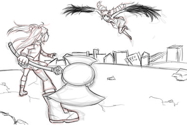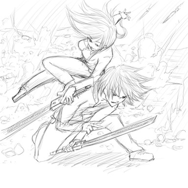 #buildings #cityscape #duo #fighting #girls #lineart #rooftop #sparkling #sparks #spear #sword #swordfight #water #waterdroplet #splashingwater